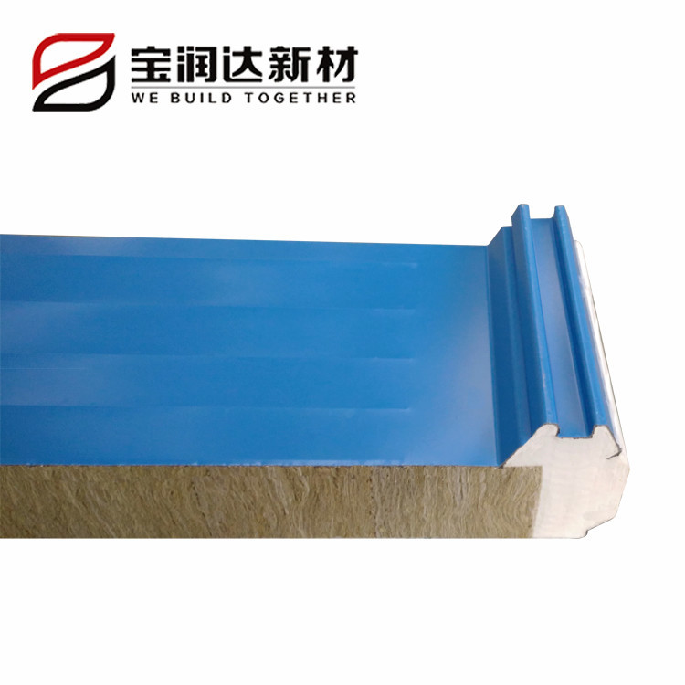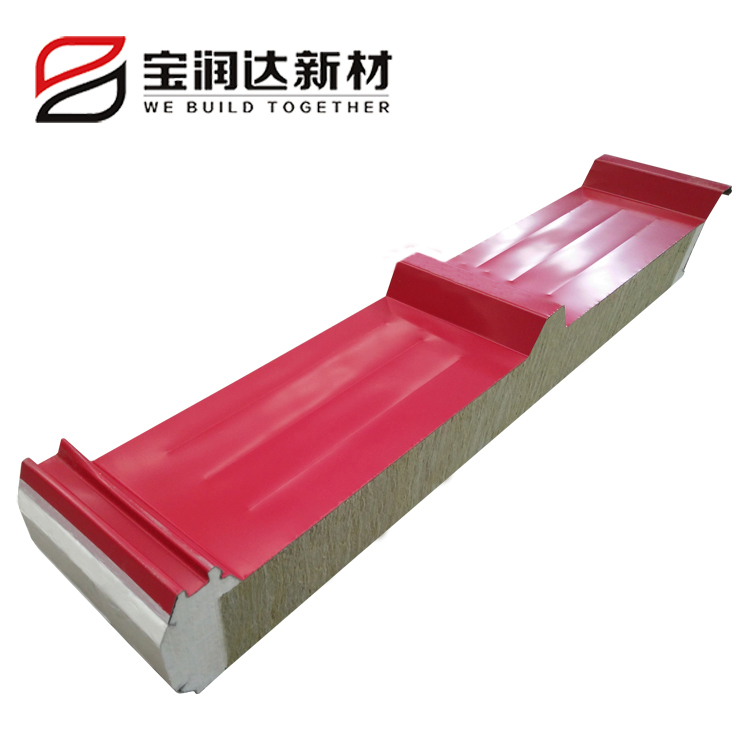 巖棉夾芯板選用憎水巖棉,憎水率大于98%。隱藏式暗釘搭接方式,獨特的防水槽設計,有效防止雨水滲透,防止螺釘生銹,延長屋面板使用年限。 |